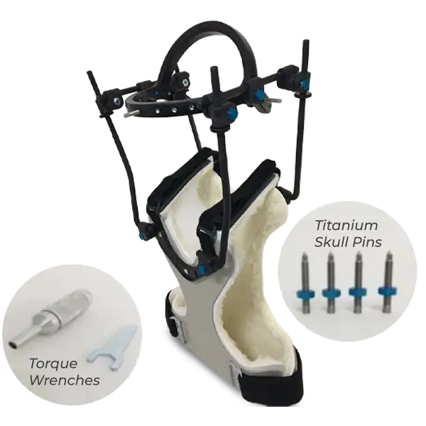 A halo vest traction system designed to provide rigid, circumferential immobilization of the cervical spine. It is a standard of care for treating complex upper cervical spine fractures, such as odontoid fractures, by securing the head to the torso via a skull-mounted ring and a thoracic vest.